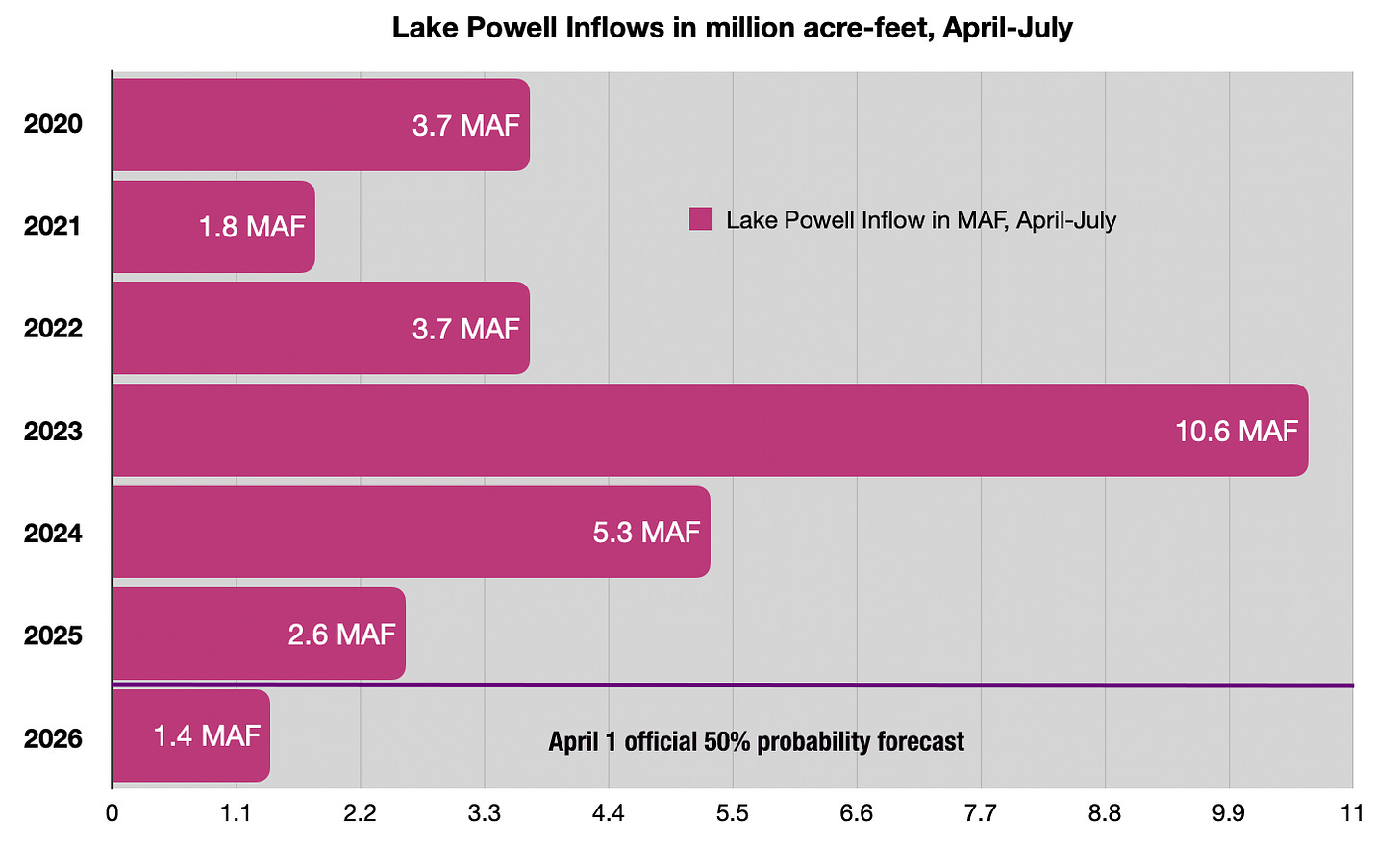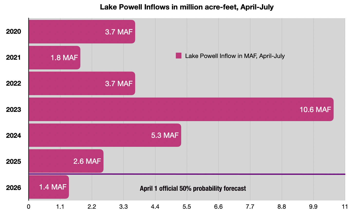 The Colorado River Basin Forecast Center is putting a number to that term by predicting that the Colorado River system will deliver about 1.4 million acre-feet1 of water to Lake Powell from April 1 through July 31. Thatâs about 23% of the median for the spring runoff season, which is when flows are most abundant, and just over half of last yearâs not so great figure of 2.6 MAF.