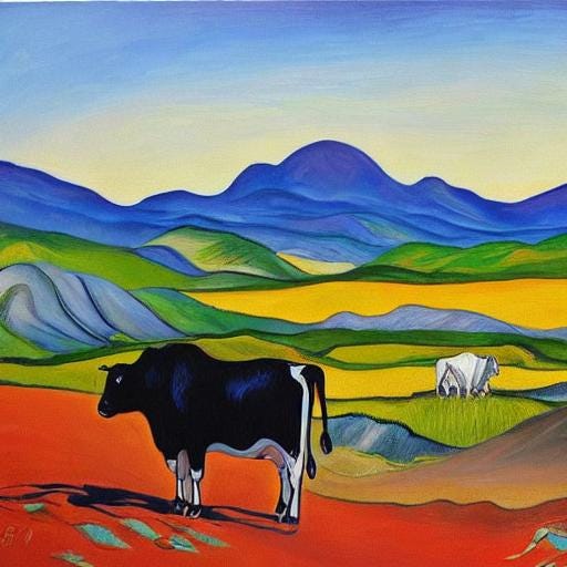 Consider me adequately freaked out. Substack now has an AI image generator, about which I’m pretty damned ambivalent, at best. But I wanted to try it out, so I asked for a picture of a cow grazing in the desert in the style of Georgia O’Keefe. This is what it came up with. On the one hand, no one would ever mistake this for an O’Keefe. On the other hand…