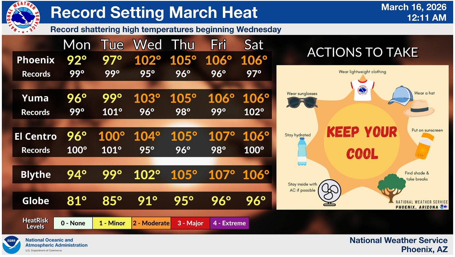 The earliest 100°F day on record in Phoenix was on March 26. That record will fall this week, along with many others, I’m sure. I mean, extreme heat warnings in March? Come on!