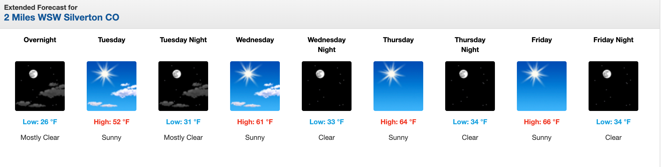 Then there’s the far-less blistering, but equally concerning temperatures in the mountains. Silverton, at 9,318 feet in elevation and near the headwaters of both Colorado River and Rio Grande tributaries, is looking to have a full-on March thaw — even at night. Look at those lows for Wednesday through Friday: All above freezing. No bueno.