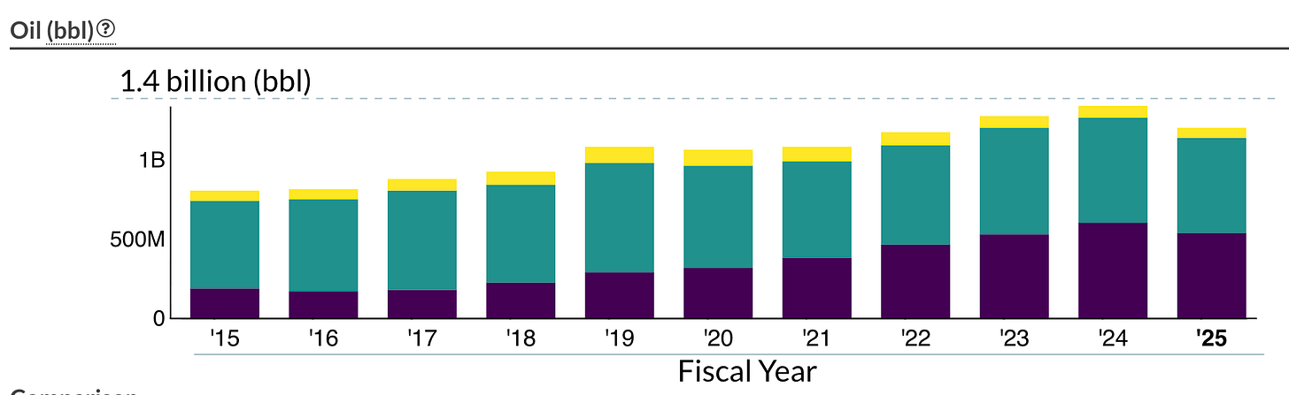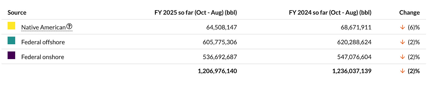 During the past year, domestic crude oil production continued to increase month-to-month, but at a slower rate than it had previously. Oil production on federal lands was down about 2% from fiscal year 2024. This is mostly due to industryâs lack of enthusiasm for more drilling, thanks to a combination of low oil prices and higher expenses due to inflation and tariffs on steel and other equipment. So much for drill, baby, drill.