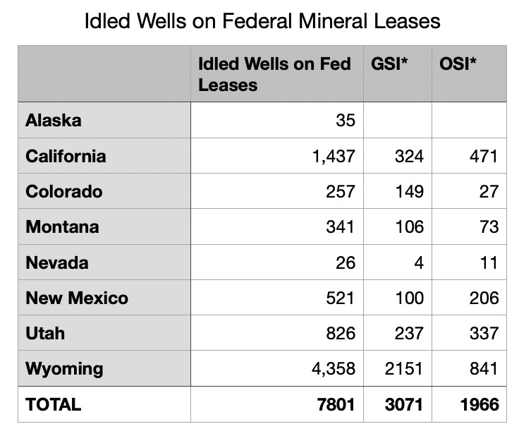I find this to be, perhaps, the most telling chart of all. It shows the number of idle wells on federal mineral leases (which includes public lands and split-estate private lands) by Western state. A lot of the wells have just been wrung dry and have been abandoned and need to be plugged and reclaimed, probably at the taxpayerâs expense.