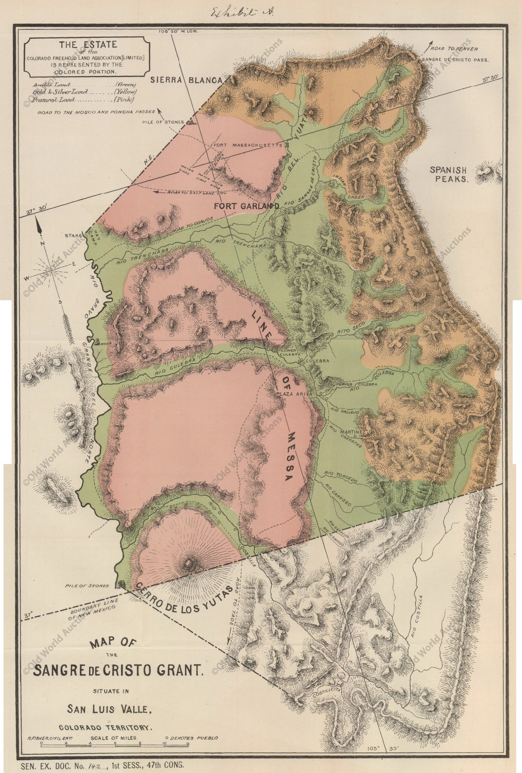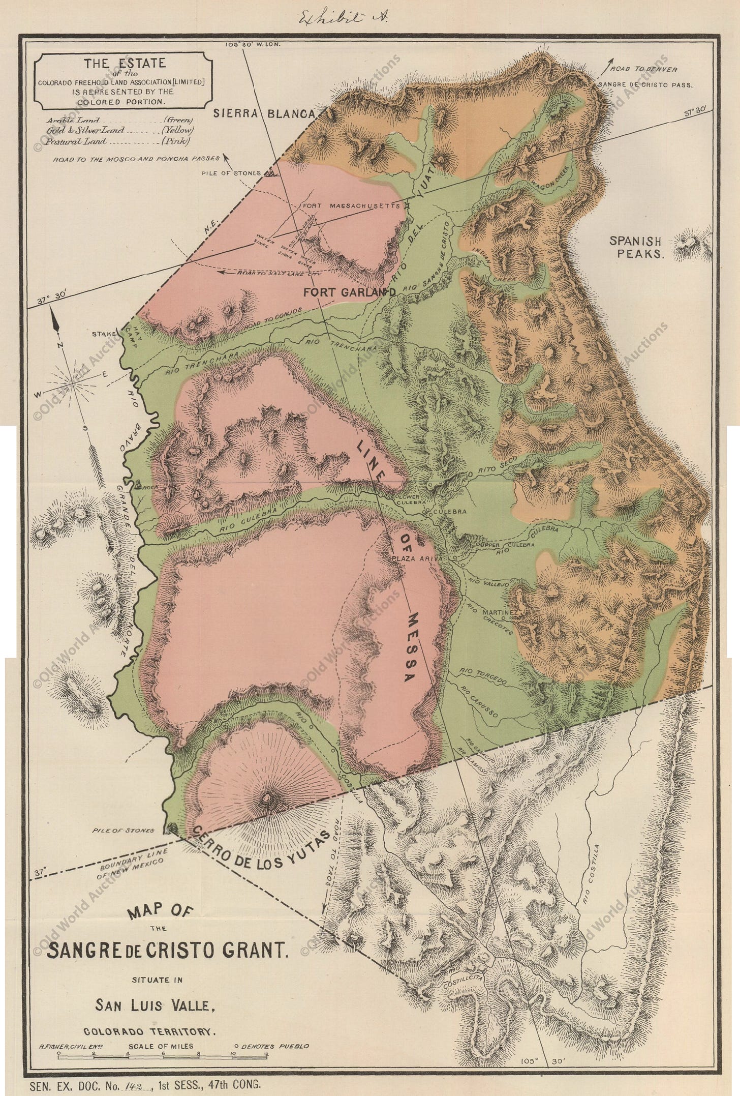 I came across this cool old map of the Sangre de Cristo land grant while perusing the Green Fire Timesâ tribute to Malcolm Ebright, who was a land grant community advocate and historian. In order to get a high-res version I had to, um, copy this from an online auction site (thus the watermarks). I donât have much to say about it, except itâs a pretty cool map of a very cool area.