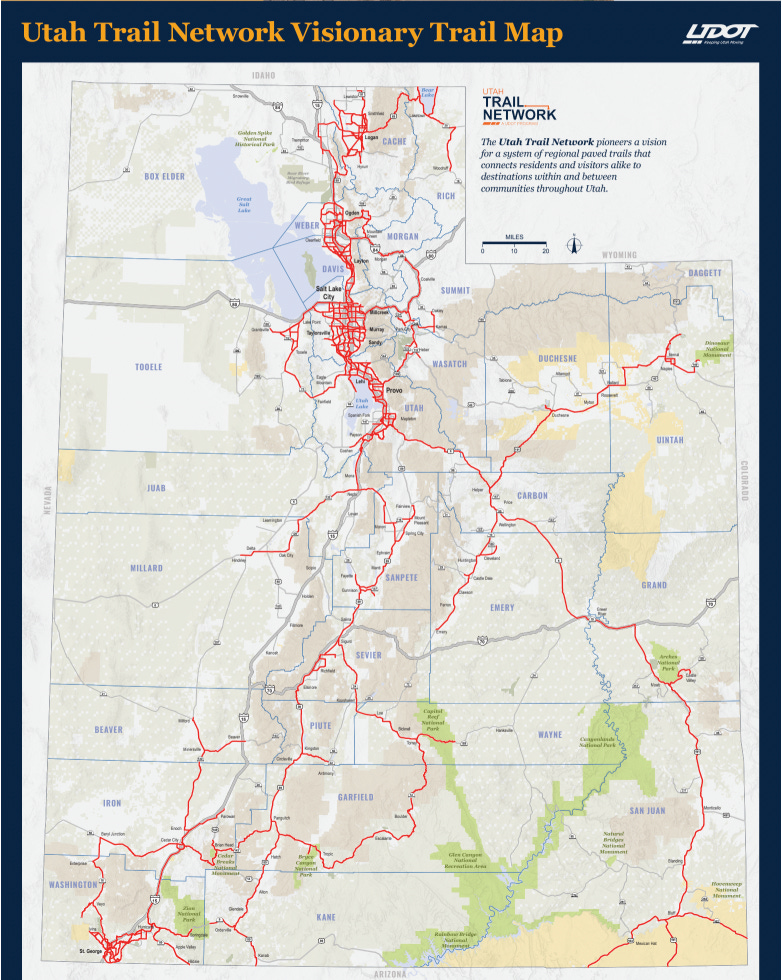 I tend to give Utah elected officials a hard time, in part because most of them — e.g. Sen. Mike Lee — are batshit crazy, set on pushing a theocratic agenda, intent on privatizing and mining and grazing and drilling public lands, and lack the critical thinking skills to see that bowing down to Trump is weak and bad for them and their constituents. But I also give credit where credit’s due, and I gotta say, I kind of like the state’s plan to build a 3,100-mile network of paved walking-biking trails that would span the state.