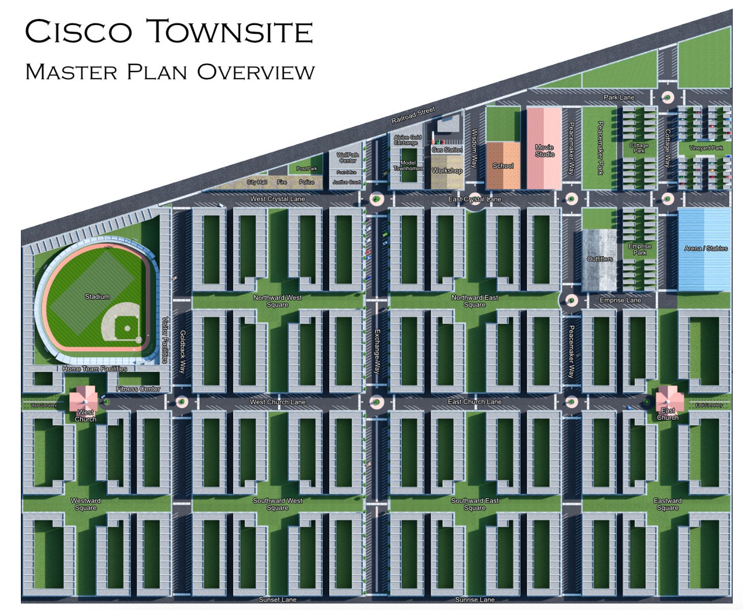 The remaining 79 acres of the platted townsite, meanwhile, are owned by Lawrence Hilton, an attorney based in Alpine, Utah, and Havilah’s trustee and developer. It’s here that he and his associates plan to develop a new town, based on the “Ward and Square” neighborhood system pioneered in Savannah, Georgia. It would include about 750 building lots covered in “tiny houses to 3,000+ square foot townhomes,” “generously sized private garages and fenced gardens,” and “open air malls with shops, cafes, & salons.” The master plan map shows not one, but two churches — the denomination isn’t specified — a movie studio1, a school, a sports stadium, and an equestrian arena and stables.