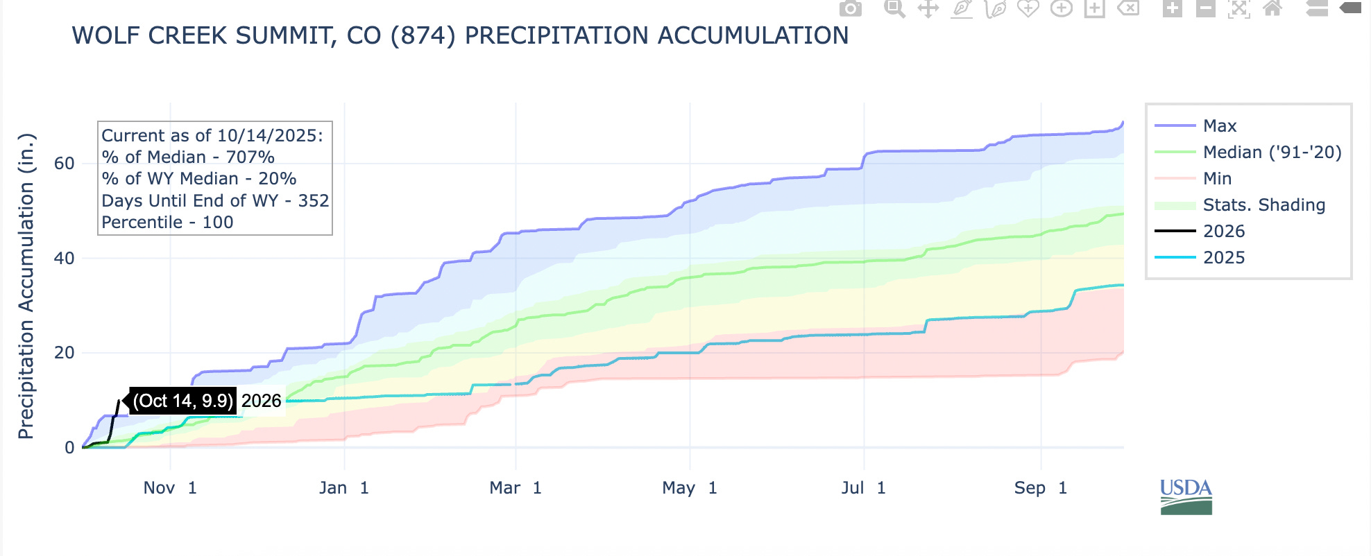 Clearly all the water will relieve some drought conditions, though certainly not cure them yet. And it is a huge start to the 2026 water year, as can be seen in this graph of accumulated precipitation at Wolf Creek Pass. The station has received 9.9 inches of rain in just two weeks, the highest amount on record.