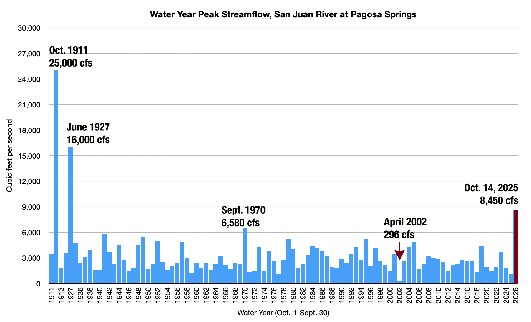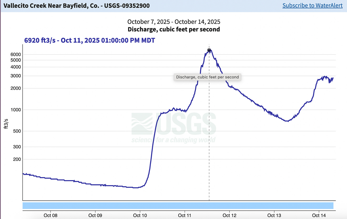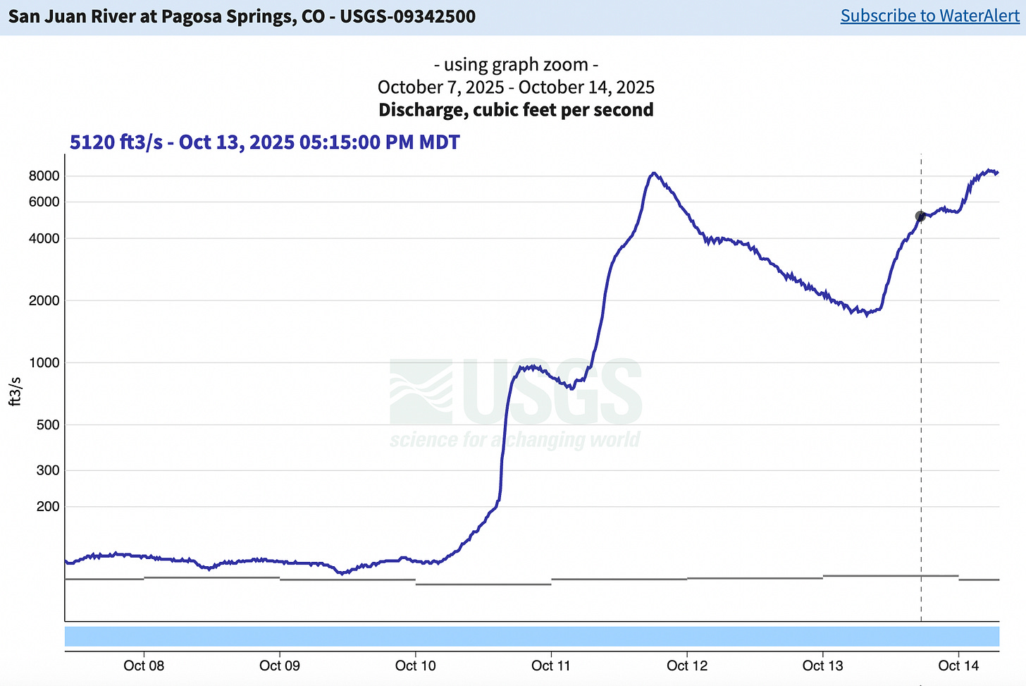 The San Juan wasn’t the only river to rage. Vallecito Creek above the reservoir hit a mind-blowing 6,980 cubic feet per second on Oct. 11, forcing the evacuation of hundreds of homes in the area. The second wave was substantial, as well, but so far isn’t as extreme as the first wave.