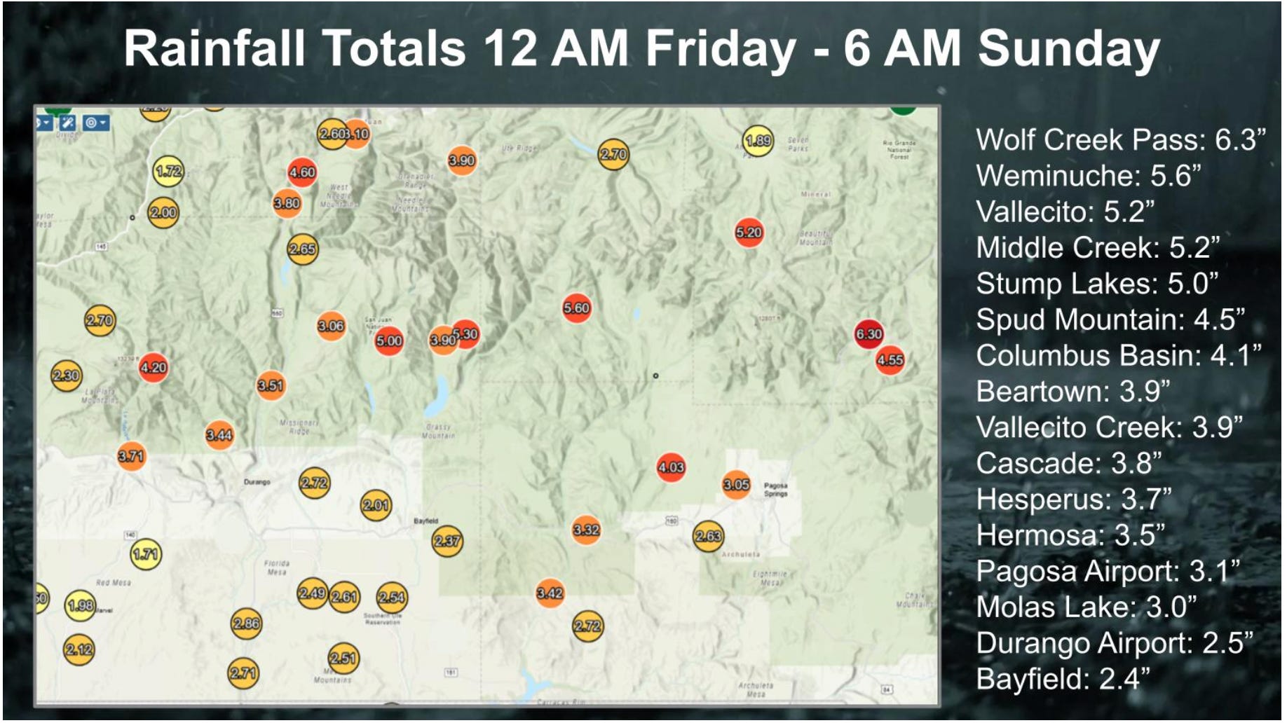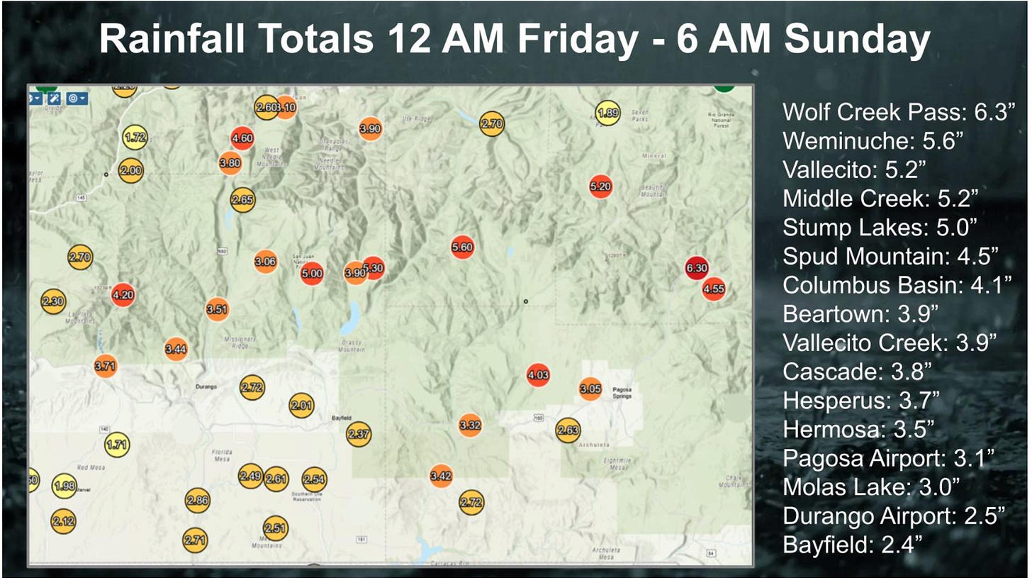 Priscilla favored — if that’s the right word here — the high country, depositing more than four inches of rain during the first wave at Columbus Basin in the La Plata Mountains, more than five inches at the Vallecito SNOTEL station, and more than six inches at Wolf Creek Pass. Interestingly, Molas Pass south of Silverton received “only” three inches during the first wave.