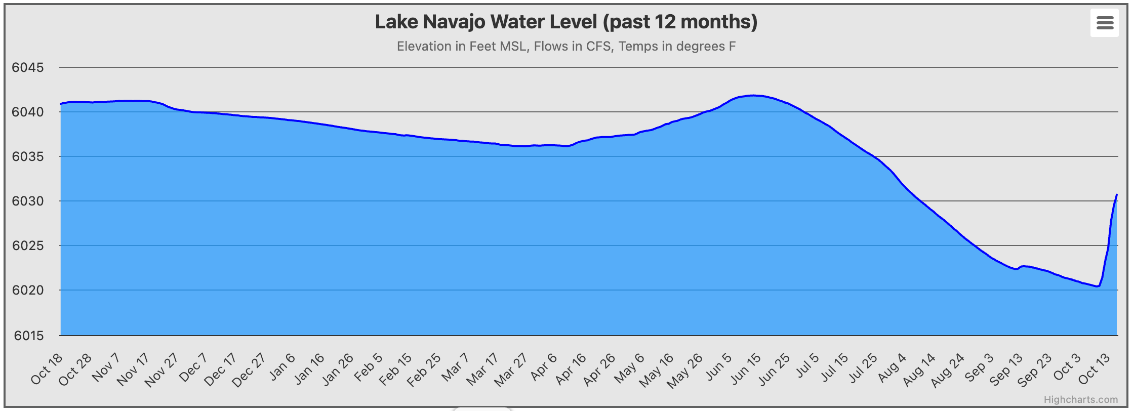 As one might expect, the recent rains and resulting flooding boosted reservoir levels. Navajo Reservoir saw its surface level jump considerably (rising about 10 feet) due to all that water in the San Juan River. However, itās still lower than it was this time last year.
