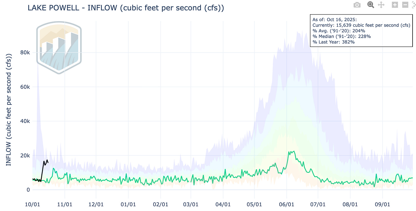 Lake Powell, which is much, much bigger, only added 1.28 feet to its surface level, and remains 32 feet below what it was on this date last year. But as the following graph shows, the big water is still making its way into the reservoir, so its level could keep climbing.