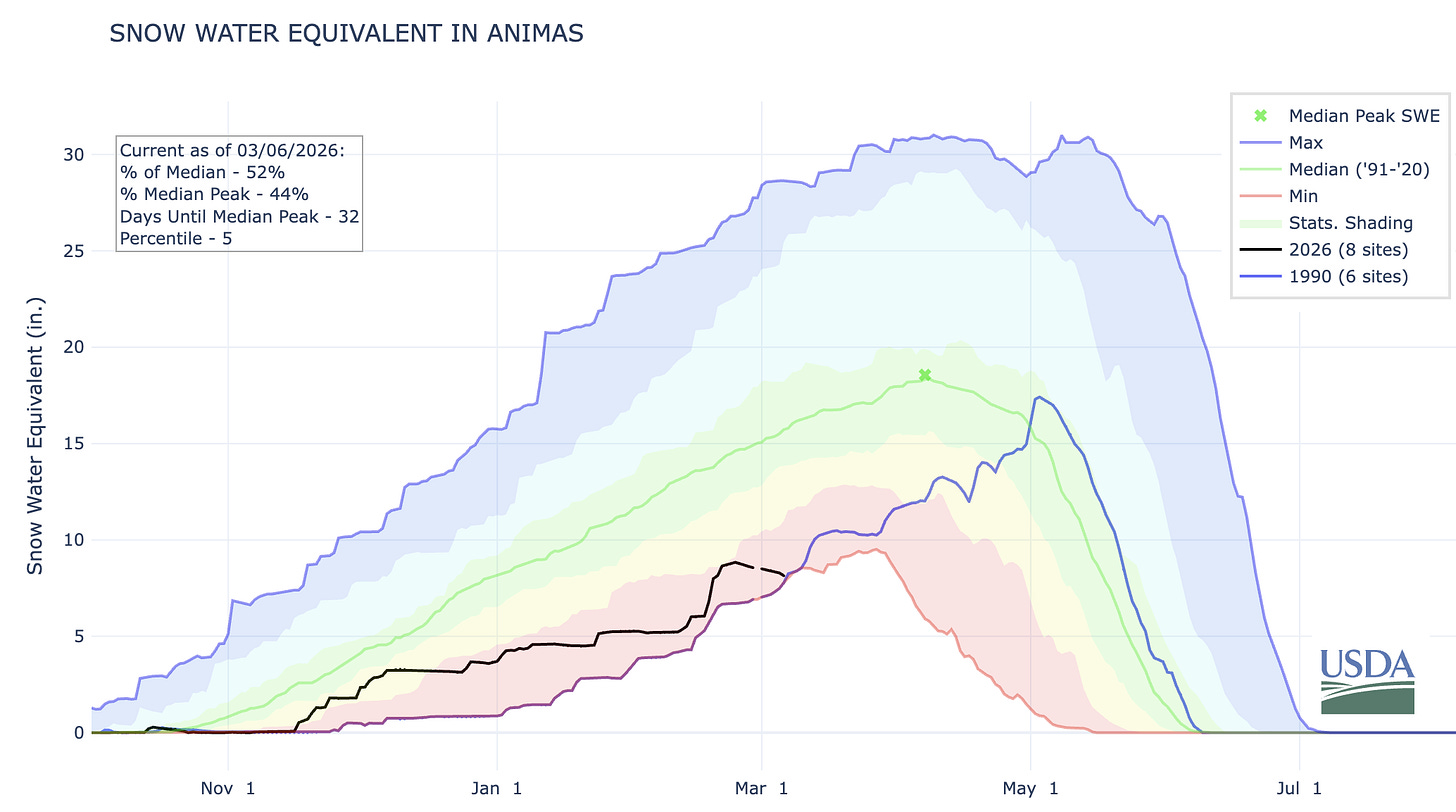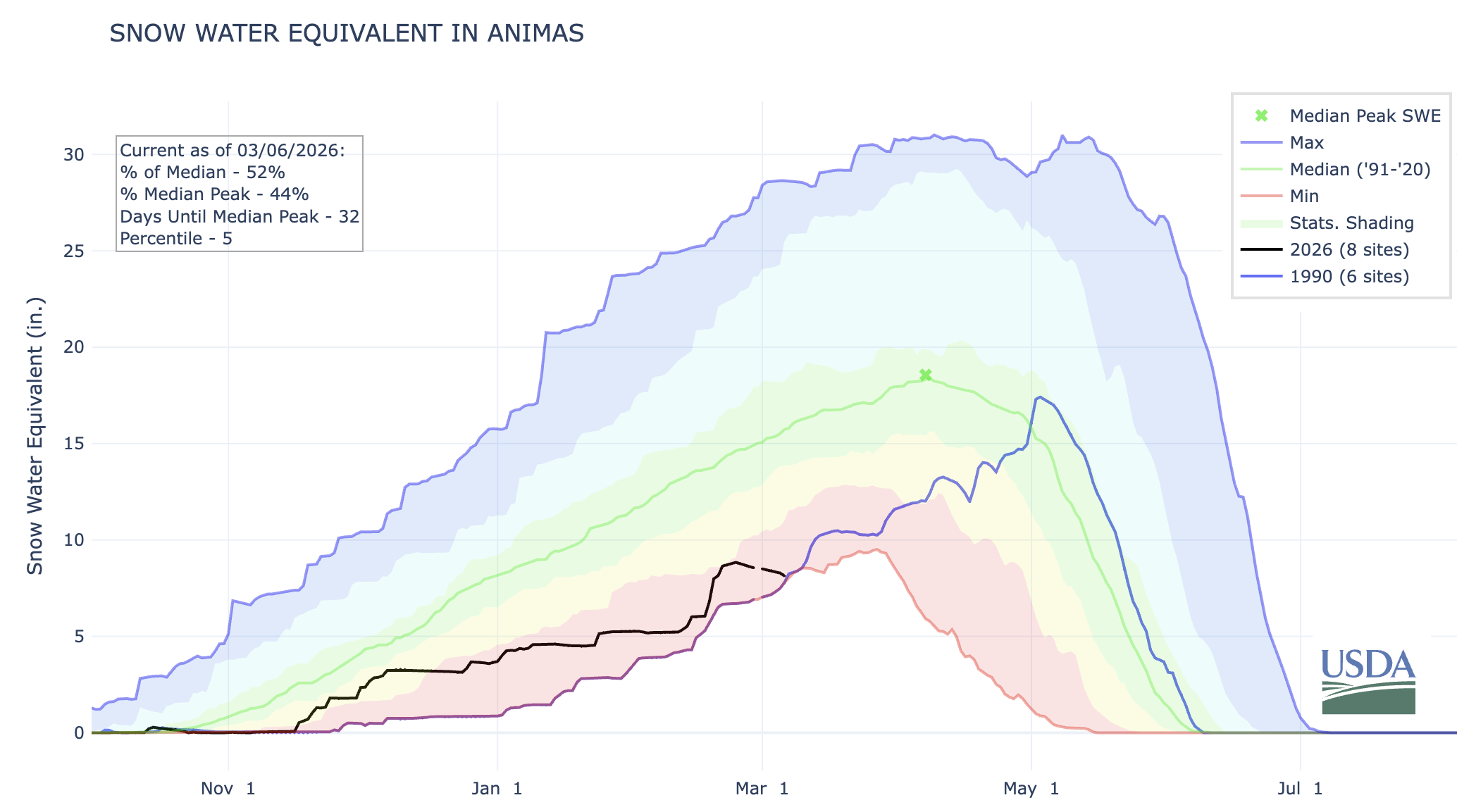 Hope lies in 1990: That year, snowpack levels in the Animas River watershed were lower on March 6 than they are today. But beginning in mid-March, storms pummeled the region, resulting in a May 3, 1990, snowpack peak that was 94% of normal and bringing runoff up to decent levels. We could see a repeat of that March-April-May miracle!