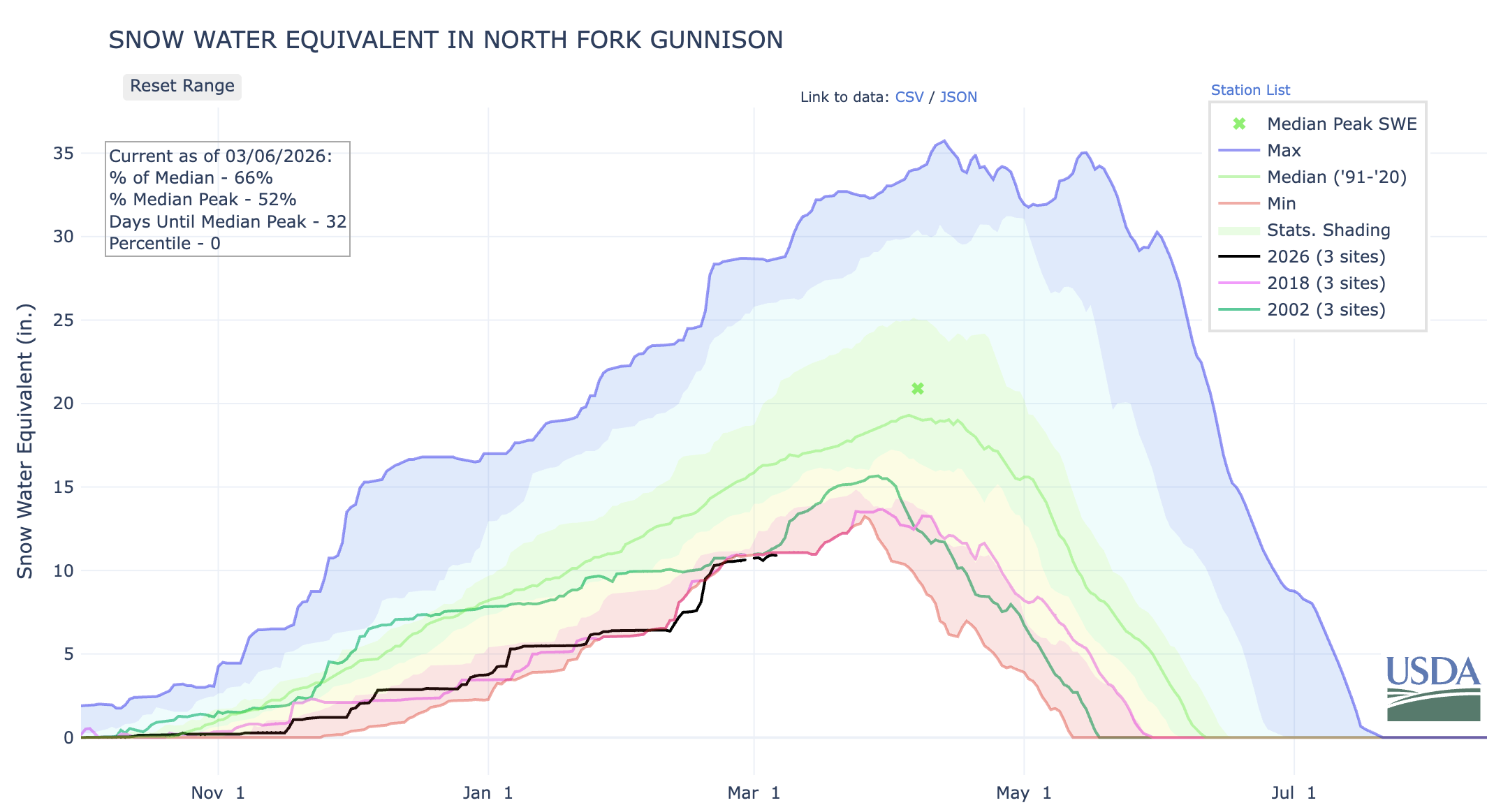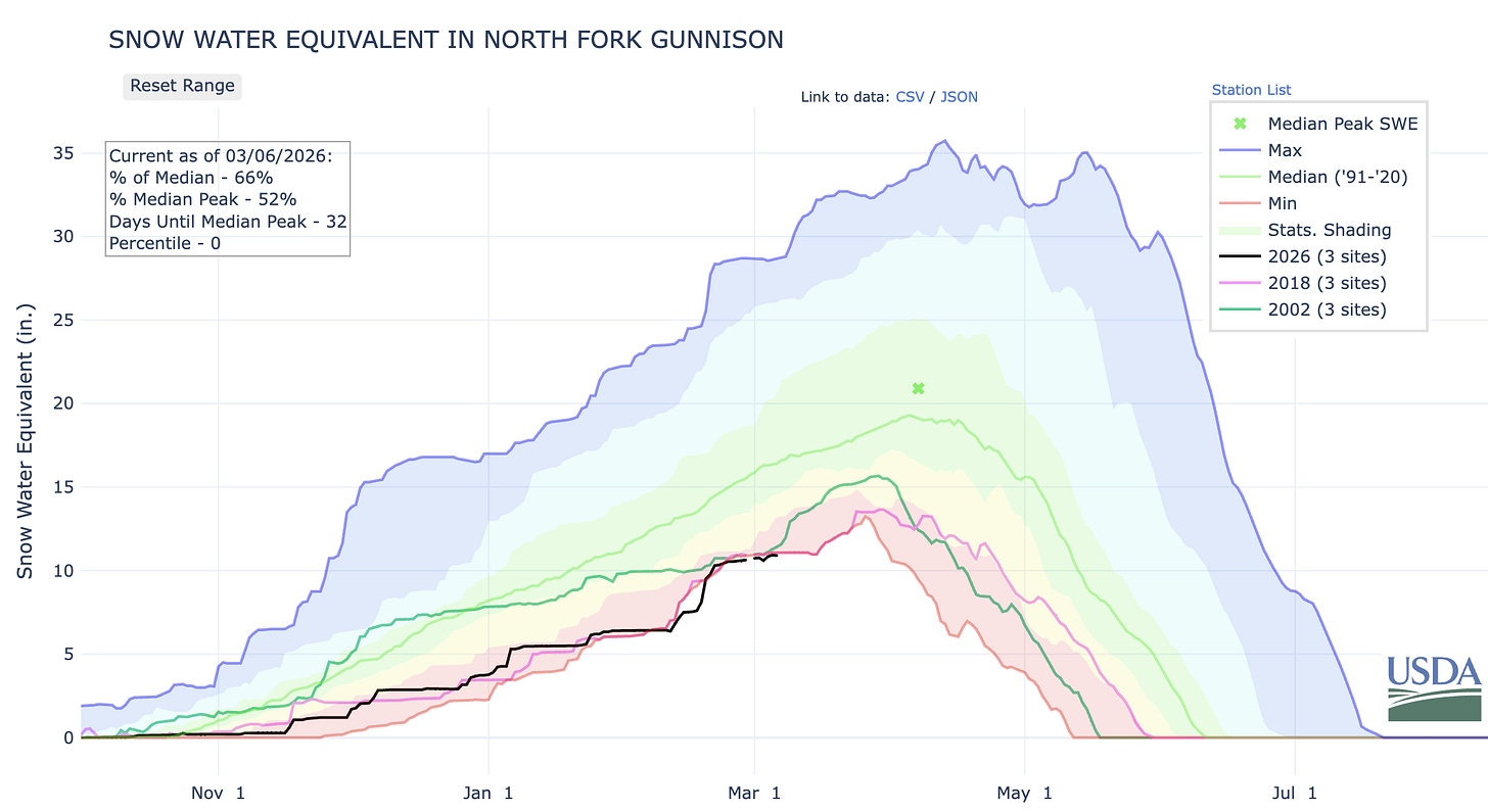 I tend to rely on a handful of high-elevation SNOTEL sites as indicators of how the mountain snowpack is doing. One of them is in Columbus Basin in the La Plata Mountains. Like everywhere else, the snow water equivalent there is way below normal. However, itās still above 2002 levels for early March, so thatās kind of heartening. I guess?