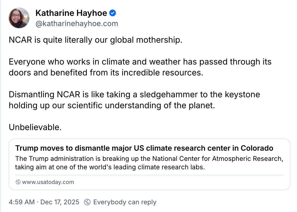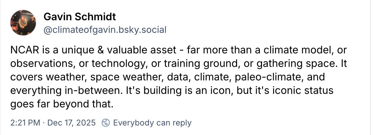 This will not only hurt Colorado, but also science and all the people who are affected by climate and weather and the like, which is to say: everybody, this harms us all. Here’s a couple Blue Sky takes from prominent scientists: