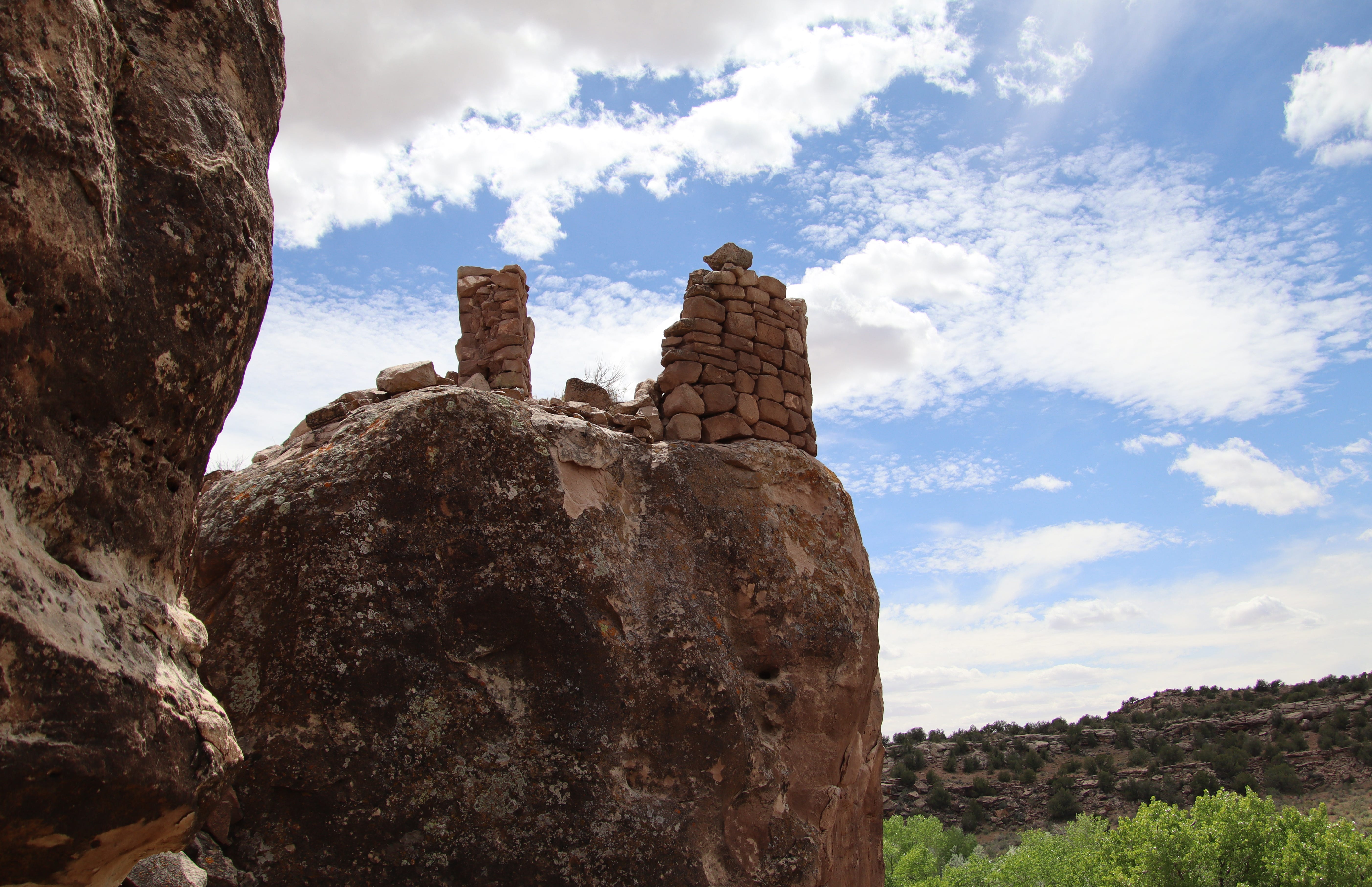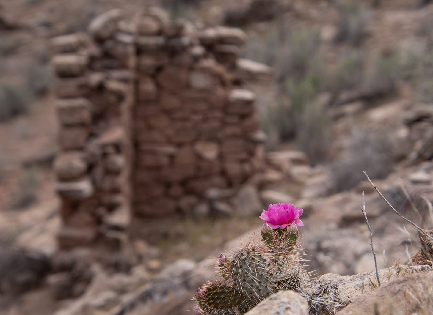 As I hiked toward the pueblo, jumping from stone to stone so as not to trample any cryptobiotic crust, I noticed the hill and decided to climb it to get a better view. The shrine is a pleasant surprise, the horses below and their enigmatic actions a slightly unsettling one.