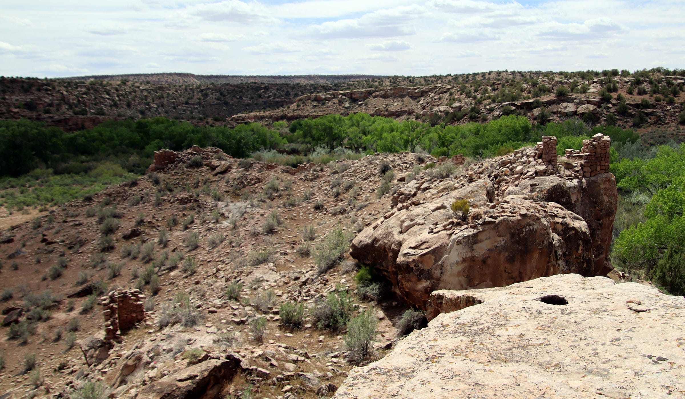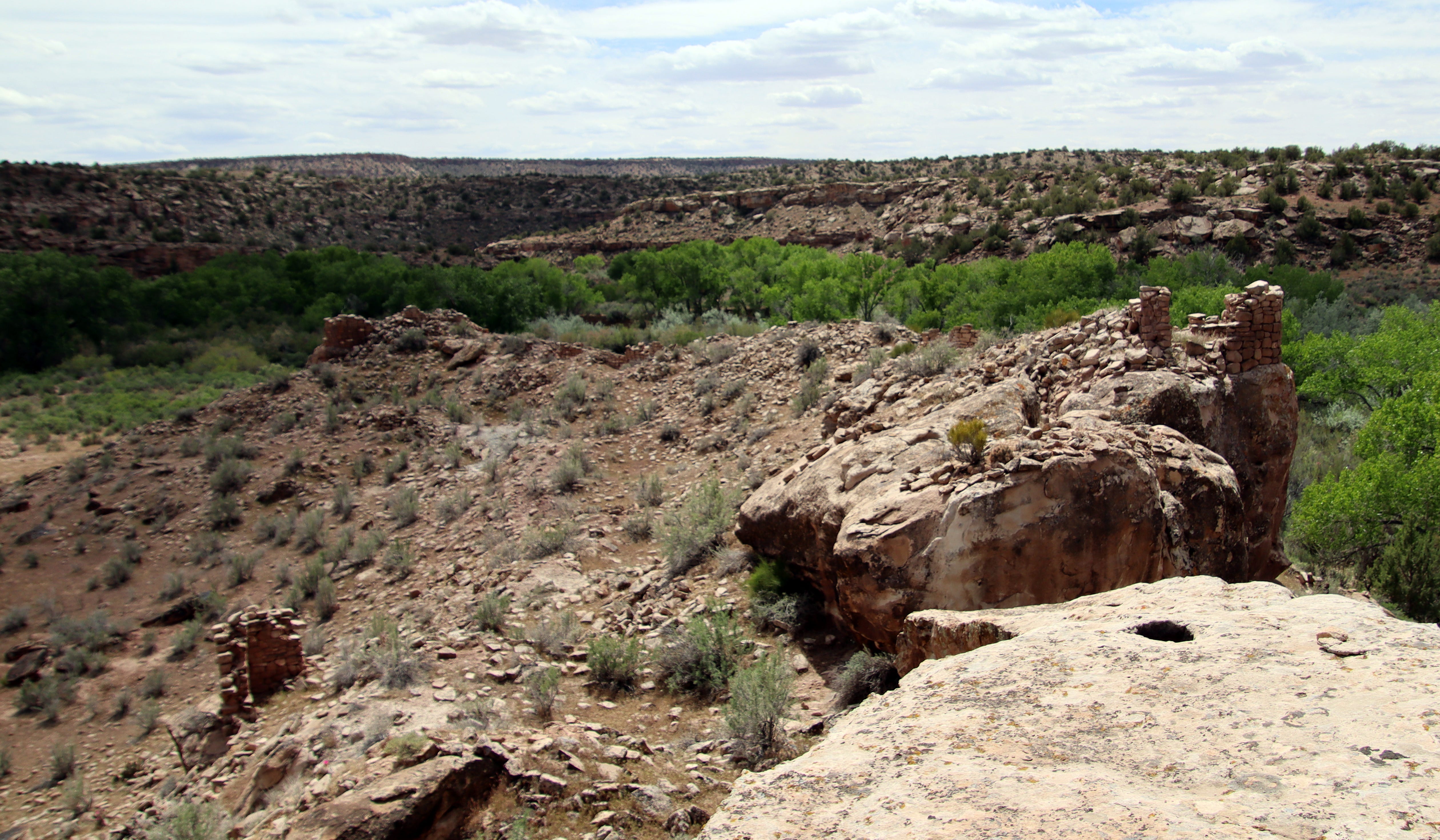 When I reach the pueblo I see why Jackson called it a castle: Though only a few standing walls remain, the amount of rubble indicates it was a substantial complex, with some two-story buildings, perched on a peninsula of sandstone above Yellowjacket Creek on one side, and a large flat area on the other that may have been agricultural fields.