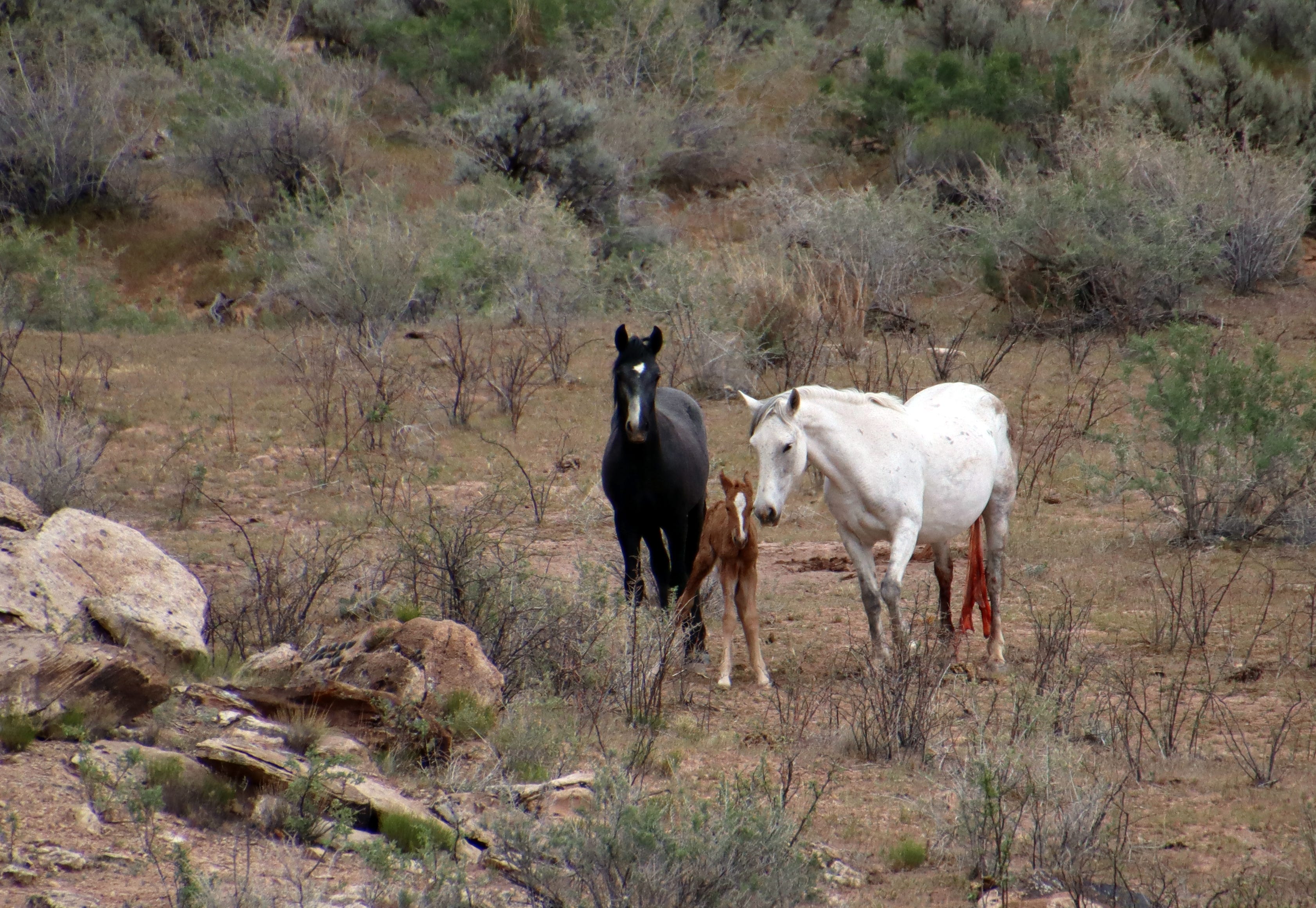 The white horse lies on the hard-packed reddish earth. The black horse stands over her protectively, as if shielding her from the harsh sun or the stiff breeze, redolent of sagebrush. Maybe she is injured, maybe just resting. From my perch some 250 vertical feet above them I can’t tell, even with the help of my camera’s telephoto lens. Not that my assessment matters: The horses probably are wild, and it would be wrong for me to interfere, even if I could.