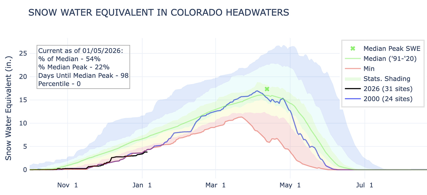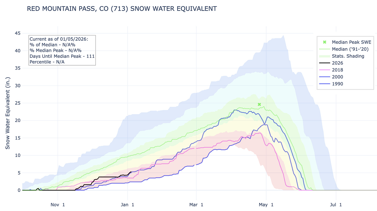 The San Juan Mountain snowpack levels are currently at about 50% of normal for the first week of January, and they are tied for third lowest snowpack level on record for this date. Thatâs not âtoo bad,â itâs downright dismal. And snow cover is even more meagre in other parts of the state: The Colorado Riverâs headwaters SNOTEL station is experiencing the lowest snowpack since it started recording in 1986.