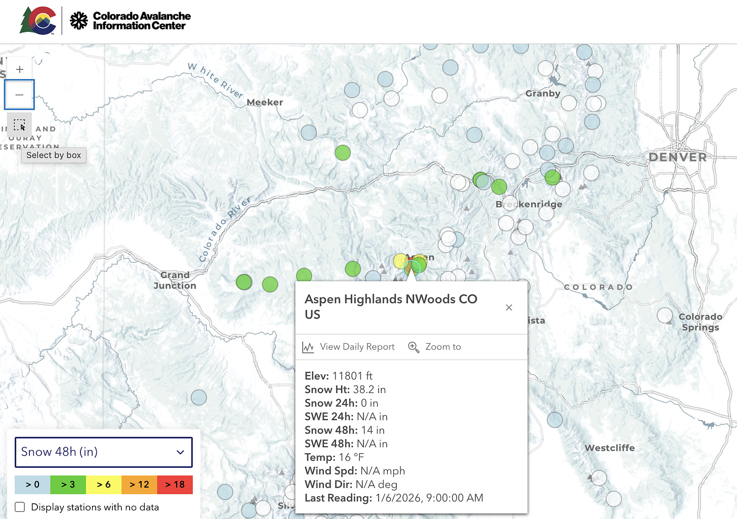 Now for a little New Yearâs treat for all of you weather/map nerds: The Colorado Avalanche Information Center has launched an interactive map that shows 24-hour and 48-hour snowfall and snow water equivalents at various locations across the stateâs mountains, letting you see at a click where the good powder is and isnât. You can click on each station and get all the details, including current temperature and snow depth.