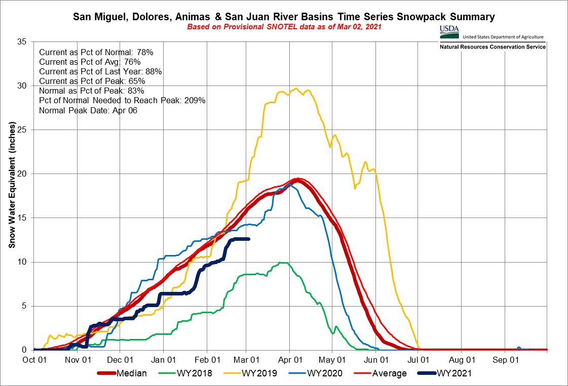 the Animas River in southwestern Colorado, an indicator of San Juan Mountain snowpack, hit a record low in December and then again in February;