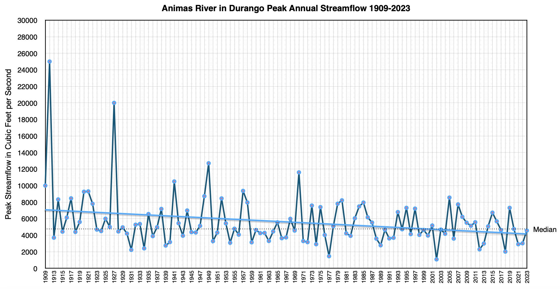 The 1911 event is typically considered to be the Four Corners Country’s biggest flood, based on streamflow estimates, anecdotal accounts, and the damage wrought. Since then it has been rivaled only by the June 1927 flood, when the Animas River in Durango reached 20,000 cubic feet per second; and in 1949 and 1970 when the high-water mark was about 12,000 cfs and 11,600 cfs, respectively. That might make 1911 seem like a freak event — a once-in-a-millennium confluence of factors. Combine that with the fact that the river’s annual peak streamflows have trended downward over the last century or so, and a 1911 repeat seems less and less likely.