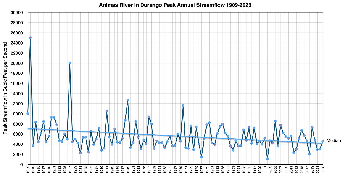 Great timing with this! In my geomorpholgy class at FLC we were just yesterday calculating flood RIs for the Animas River based on the gage record. Depending on how you project it out, the "500 yr" flood could be as much as 40-45 kcfs.