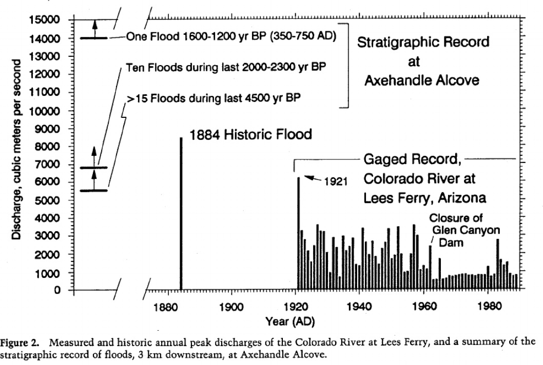 We can extend the timeline dramatically by turning to paleoflood hydrology, which is sort of like dendrochronology, except instead of looking at tree rings to understand past climate, it uses geological evidence — slackwater lines, debris — to reconstruct the magnitude and frequency of past floods. I skimmed the available literature, including this Bureau of Reclamation survey of studies, and here’s what stood out: