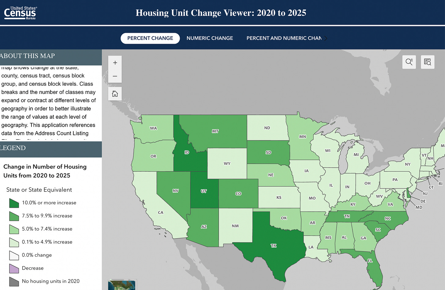 This is a pretty cool tool released by the U.S. Census Bureau a little while back. It shows how many housing units were added (or lost), along with the percent change, from each state, county, town, and even census tract between 2020 and 2025. Assuming itâs accurate, it could really help inform discussions about housing supply and demand, about the drivers of the housing affordability crisis, and whether land-use regulations and NIMBYism are really shutting down housing construction.