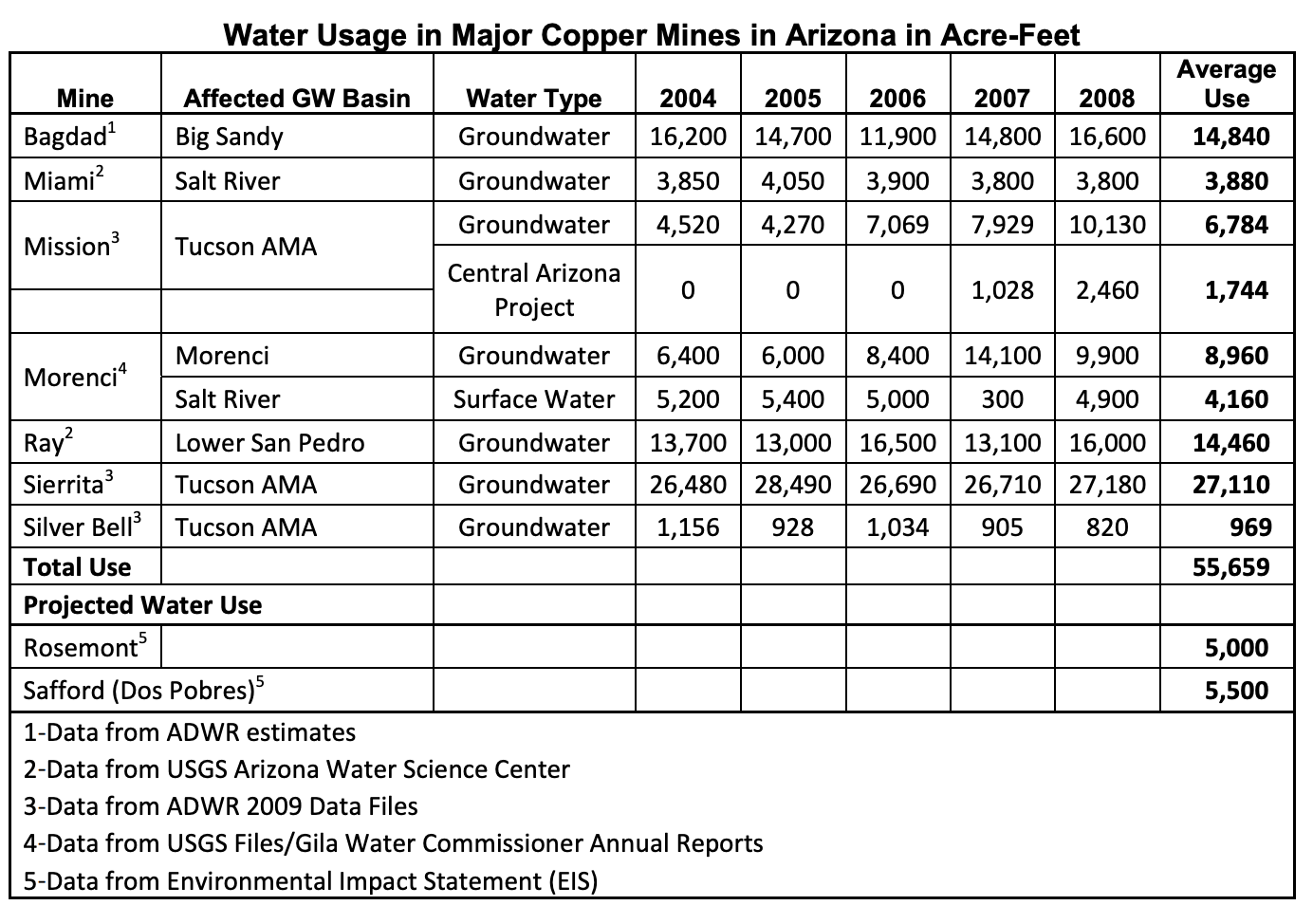 The following chart is from an Arizona Department of Mines & Mineral Resources report from 2010 by Dr. Madan M. Singh. It’s a nice, comprehensive look at how much water the state’s major mines used in the preceding years. Current use is likely about the same, except that now there are additional mines (the Pinto Valley Mine was not operational in 2010, which is why it’s missing).
