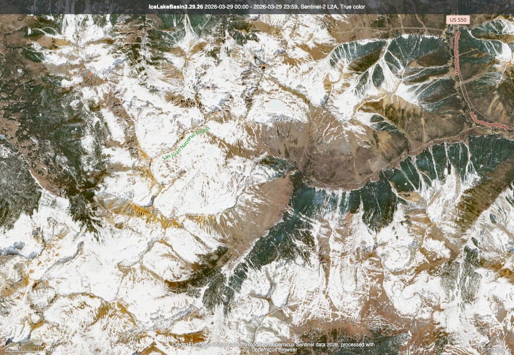 Last week I did the NASA Worldview satellite snowpack comparison, this time it’s Copernicus. The big difference is that you can zoom out more with Worldview, and zoom in for higher resolution looks with Copernicus. So here I went and found imagery from the San Juan Mountains in late February of this year, which is when snowpack levels peaked in the Animas River watershed, and another one from late March, following the big fat melt out.