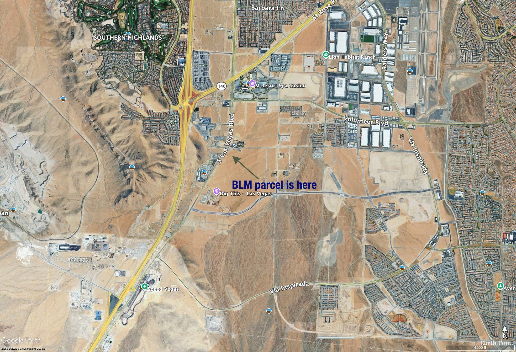 That said, I’m curious about the choice of this particular parcel, more from an urban planning perspective than a public-land-transfer one. This is not one of those tracts surrounded by suburbia, but lies on the suburban fringe. It’s not in an existing neighborhood or even all that close to one and is beyond the reach of the bus line. It’s across the street from Combat Zone Paintball and a huge RV sales center and just up the road from Dig This Vegas, a “heavy equipment playground.”