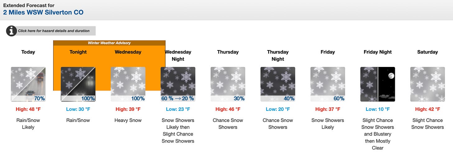 Oh, and also: Even though the snowpack is ultra-thin, at least it’s not gone at these high altitudes, providing a base for the snow that this week’s forecasted storm should bring. There may still be some powder skiing to be had this season after all! (Scroll down for a weather forecast).