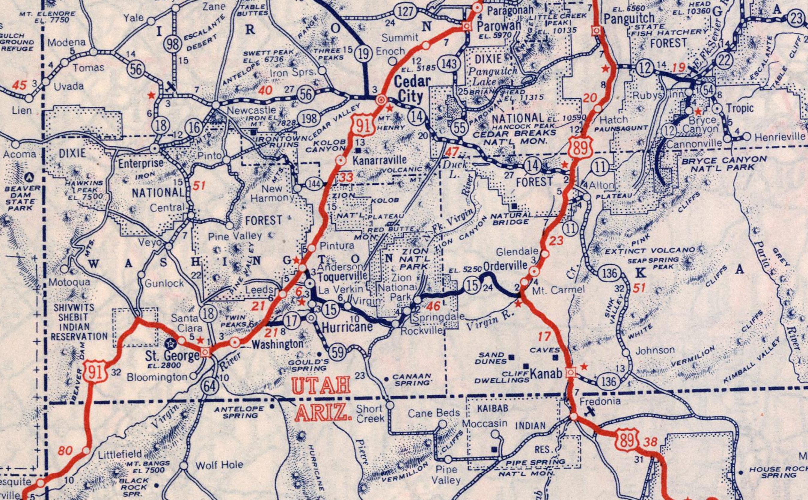 On the bottom map, note that I-15 didn’t yet exist, and the major artery through southwestern Utah, Hwy 91, bypassed the Virgin River Gorge south of St. George. I have to say, I really wish they hadn’t built an interstate through that lovely canyon. Also notable: Hildale, Utah/Colorado City, Arizona was simply Short Creek back then, and was on the Arizona side of the line (possibly where “Old Colorado City” is now?).