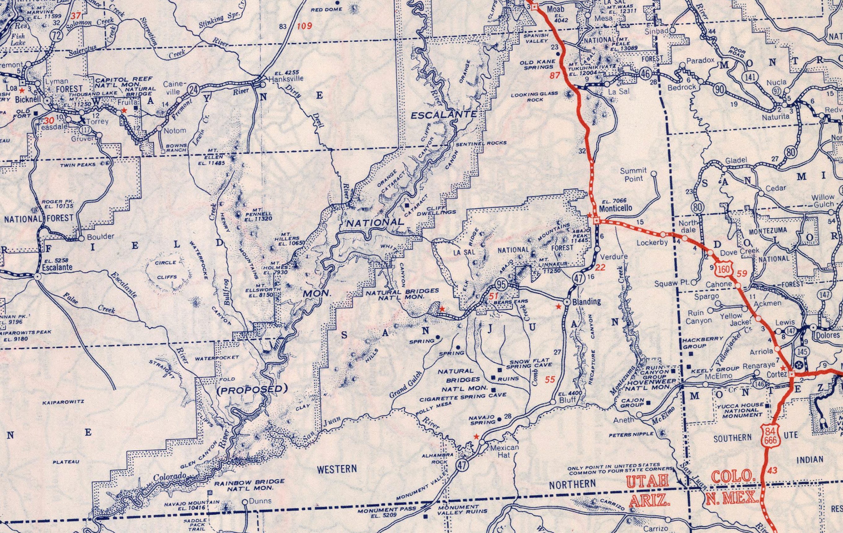 Also note what is absent. The town of Page didn’t yet exist, because it was created to house workers building Glen Canyon Dam (construction began in 1956). Highway 95 followed a different route over Comb Ridge and ended at Natural Bridges NM. And the Moki Dugway road wouldn’t be built until the 1950s.