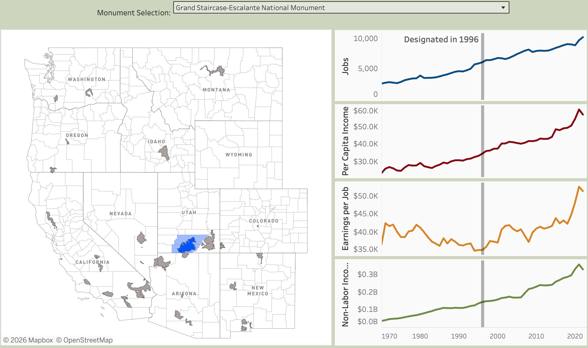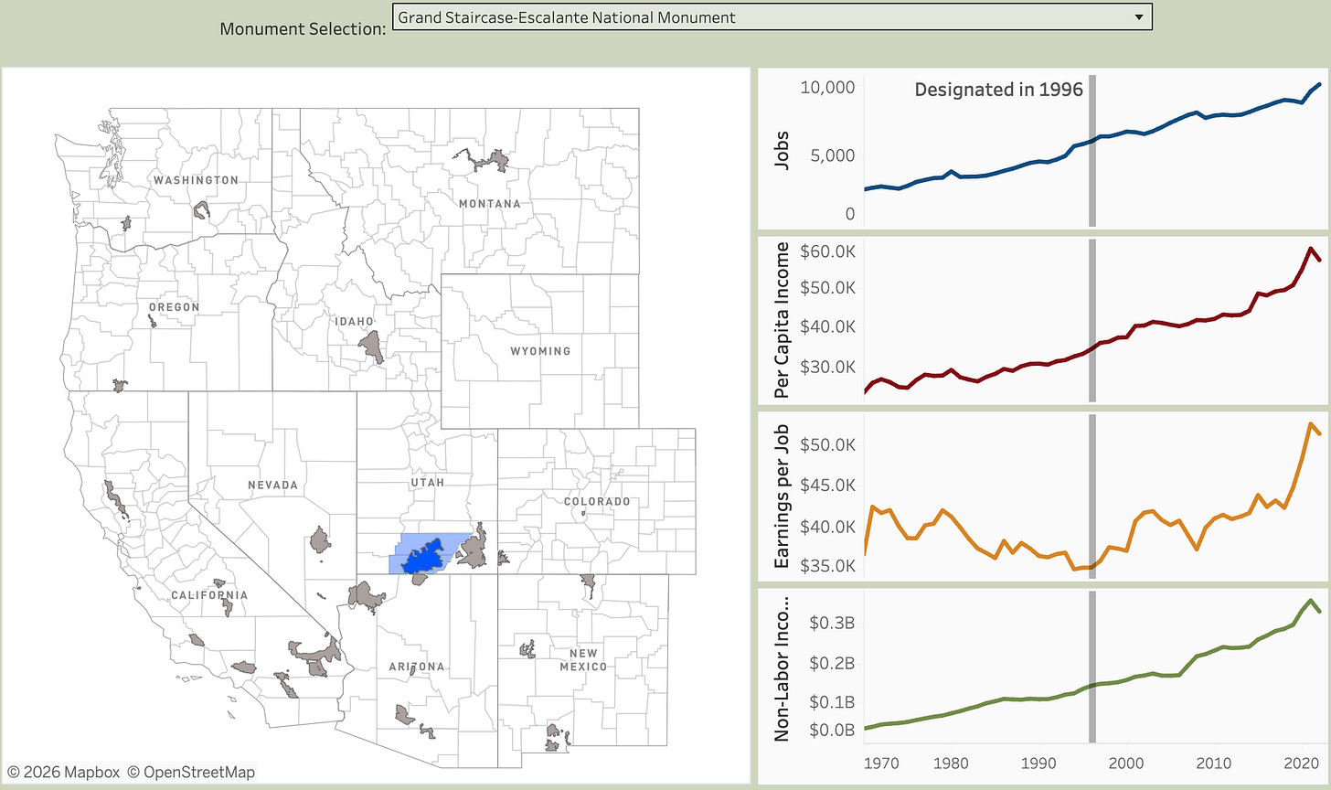 Headwaters has a nice interactive graphic on which you can check out the economic trends around the 30 national monuments. The trends, themselves, are interesting to see: They make it abundantly clear that other factors, especially COVID-19, had a much bigger effect than any national monument designation.