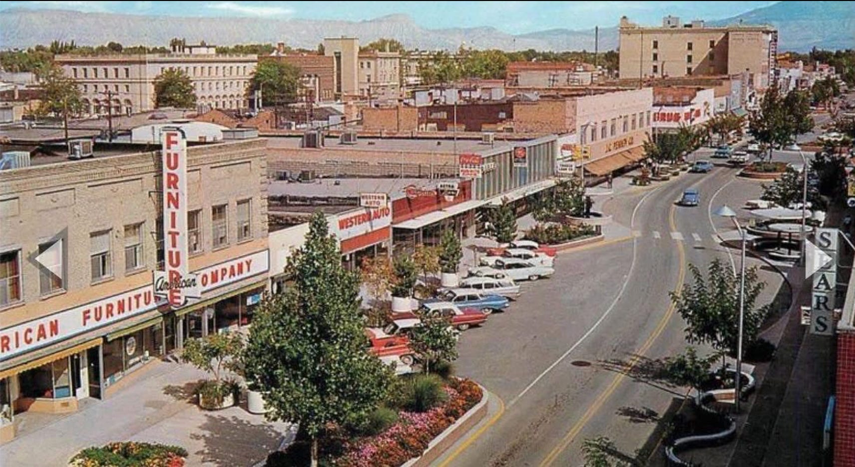 This one popped up on my Facebook feed and I just had to purloin it. It’s downtown Grand Junction in the 1960s (I believe), not long after they refashioned the main drag to make it more people-friendly. It’s funny because a lot of folks in my hometown of Durango are freaking out about a proposal to do something kind of like this, but even less radical, to its downtown. They claim that widening sidewalks and so forth will destroy the historic integrity of the streetscape. In my mind, this photo illustrates how untrue that claim is.