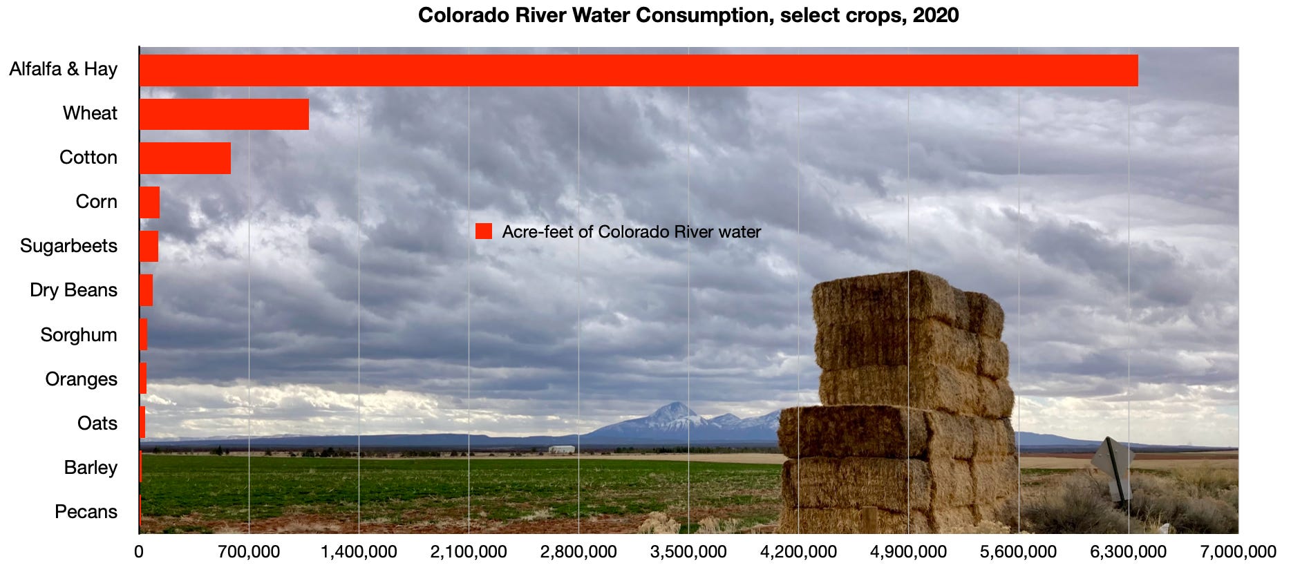 The math dictates that the biggest user, irrigated agriculture, is going to have to make the biggest cuts. And the crop that uses the most water? Alfalfa — by a mile. About 6.3 million acre-feet of Colorado River water is consumed to irrigate alfalfa and other hay crops.